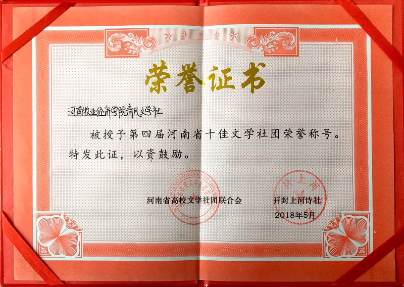 近日,第四届河南省高校文学社团交流峰会在开封河南大学金明校区顺利举办,来自河南省各地区的200多名高校文学社团代表参加了此次交流会,会上评选了“2018年度河南省十佳文学社团”、“二十二优秀社团”、“河南高校文联优秀干部和优秀会员”等,必赢242net青风文学社作为参会代表之一,荣获“第四届河南省十佳文学社团”荣誉称号。