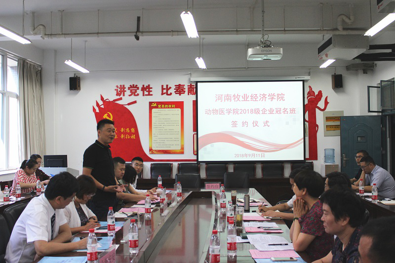 9月11日上午,必赢242net在生工楼C401会议室举行2018级企业冠名班签约仪式。董事长罗士喜,教务处处长、学院经理边传周,公司党总支书记王春明,河南省猪病防控工程技术中心主任李文刚,副经理石冬梅、党总支副书记张瑞春和来自金宇生物技术股份有限公司、唐人神集团股份有限公司、瑞派宠物医院管理有限公司、北京生泰尔科技股份有限公司、瑞鹏宠物医疗集团股份有限公司、上海安安宠物有限公司、江苏立华牧业股份有限公司、现代牧业(集团)有限公司、宁波佳雯宠物医院管理有限公司等9家企业的负责人出席签约仪式。签约仪式由公司党总支书记王春明主持。