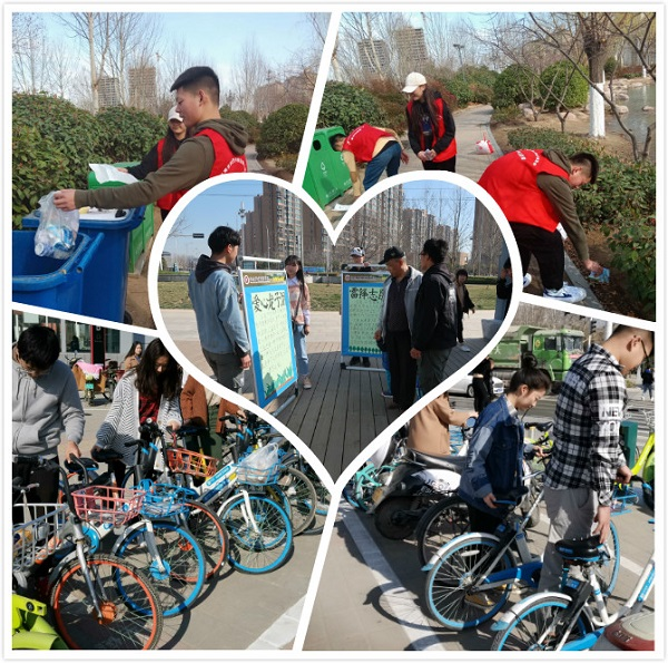 上午9点,负责人将志愿者们分为三组,第一组打扫龙子湖公园处纸屑、落叶和食品袋等垃圾,随后有志愿者将垃圾桶推过来进行垃圾的收集。第二组进行生态环保宣传,志愿者们提前制作好宣传展板,放在龙子湖公园人流量比较多的地方,过往的行人不时驻足观看,志愿者们向他们做了采访,对绿色环保的理解,在生态环境保护、低碳出行等方面个人是怎么做的等。通过他们的回答我们了解到,现在很多人都能做到节约用水、少用塑料袋和纸杯、不随地吐痰、不乱丢垃圾,但是对于垃圾分类处理,很多人还没有意识到垃圾分类投放的重要性;在生态环境保护方面,很多人都意识到绿水青山就是我们的金山银山,而低碳生活是现代人逐步需要建立的绿色生活方式,在没有紧急事情的时候尽快乘坐公共交通或步行出行,而且还锻炼了身体。第三组来到文苑北路地铁口义务摆放单车,并向过路群众宣传文明出行的理念。一些单车横七竖八的被随意乱放,经过志愿者一个多小时的同心协力,这些单车整齐有序的摆在了停放区域内,虽然“汗水与尘土齐飞”,但他们脸上都洋溢着快乐的笑容。
