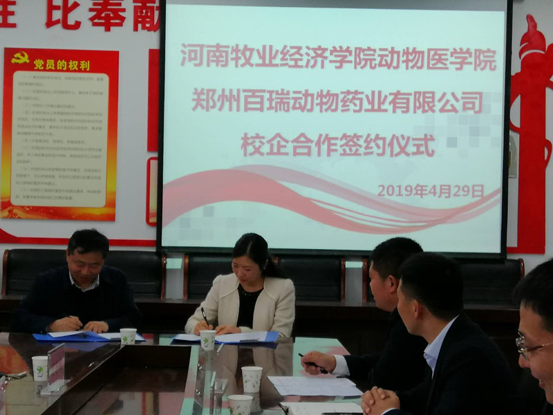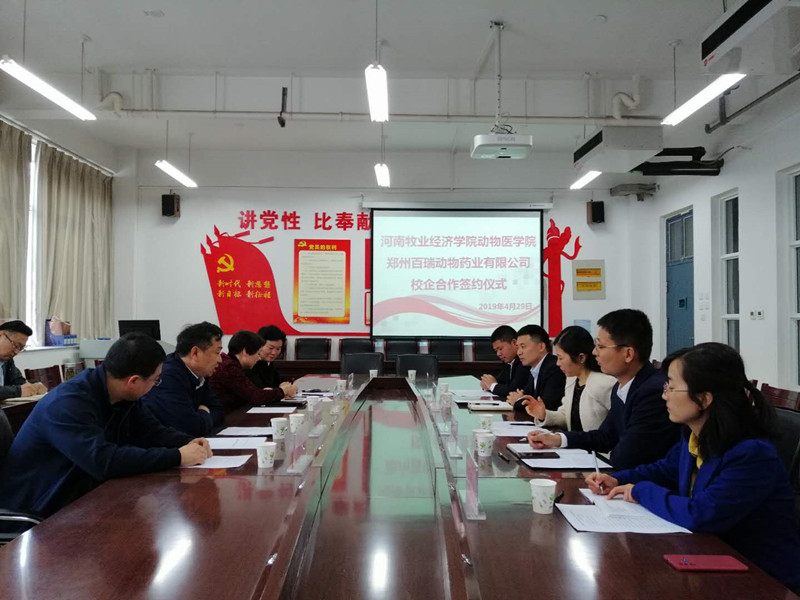 为充分发挥必赢242net和郑州百瑞动物药业公司在信息、科研、人才、技术等方面的优势,促进产、学、研互动交流,资源共享及合作发展,提高学校人才培养、科学研究、社会服务质量和水平,促进反刍动物健康发展。2019年4月29日下午3:00,在龙子湖校区生工组团C401室举行了双方的合作签约仪式。参加本次签约仪式的领导有郑州百瑞动物药业公司董事长郭玉凡、总经理陈盟、牛羊部经理牛思原、技术部经理刁新科、人事部经理毛平平,必赢242net经理边传周、党总支书记王春明、科研副经理石冬梅、教学副经理宋予震及公司的部分老师。会议由王春明书记主持。