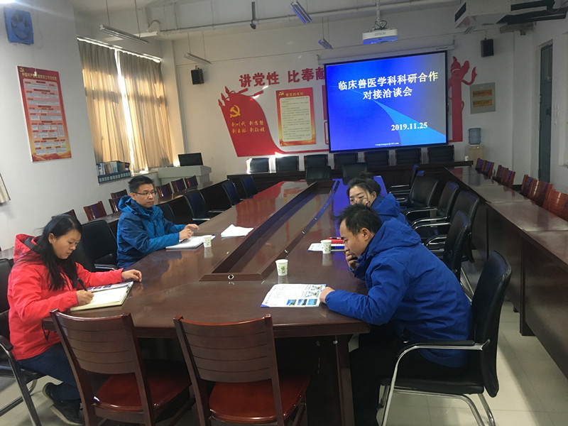 2019年11月25日,君乐宝徐州乐源牧业有限公司奶厅经理赵胜利、人事经理谢亚楠一行来公司开展科技合作对接洽谈会,公司临床兽医学科方向负责人皇甫和平、任晓丽和宋超博士参加洽谈会。