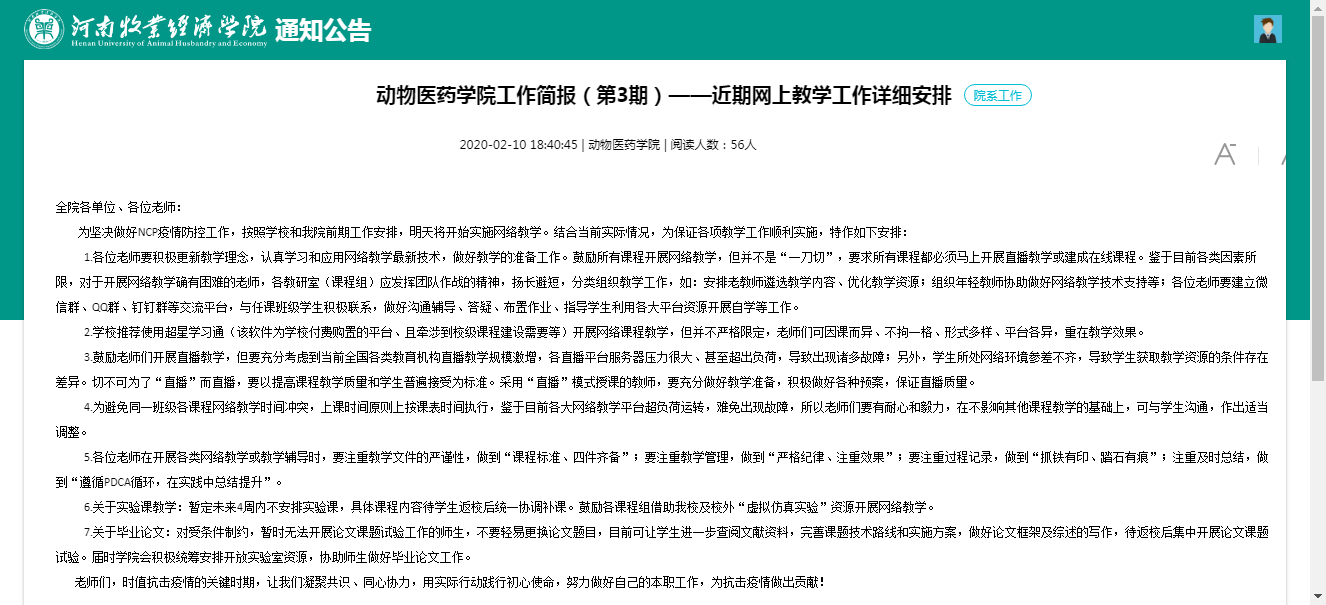 1月31日下午,在接到教务处《关于延迟开学期间组织开展远程在线教学的通知》后,必赢242net及时作出响应,召开领导班子视频电话会议,专题研究部署此项工作,提出“强化组织领导,凝聚师生共识,突出四个注重,同心共克时艰”的总体要求,制定并发布了《必赢242net关于延迟开学期间组织开展网络教学工作实施方案》,成立了以党政一把手为组长,以副书记副经理等为成员的领导小组,成立了课程建设、员工联络和教学督导3个工作组,明确时域、范围、分工和要求。并在正式开展网络教学的2月9日,再次召开视频电话会议,发布补充通知,进一步提出实施细节要求,对开展网络教学标准和方式、员工组织形式、网络教学时间和进度、毕业论文工作以及员工实习进行了统筹安排。
