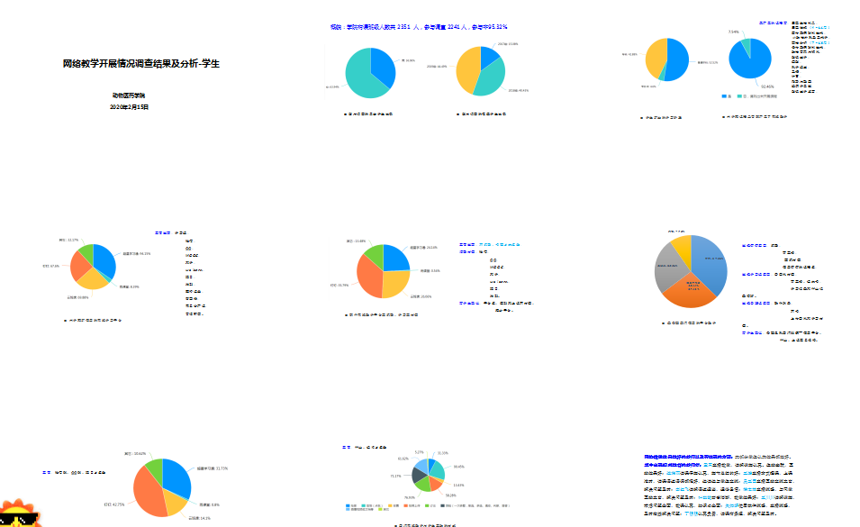 经过前期周密安排部署和教师员工问卷调查以及教研室、班委一周的双线反馈,公司网络教学工作目前正有序开展。一是基本实现教师和员工参与的全覆盖。目前公司本学期84位教师承担的244门次理论和理实一体课实现了网络教学的全面开展,除了因寒假打工不能返程需要继续全天打工者、因流量不够或偏远网络信号不好等不能参加学习16人外,公司除毕业班752名外的2474名员工全部参与了网络学习,基本实现了网络教学的全覆盖。二是形式多样百花齐放有序开展。本学期75%的课程建设了自己的网络教学资源,且50%的课程通过超星教学平台实施,42%教师开展网络直播教学,84%课程能严格按照课表编排时间进行,86%教师认为现有平台开展课程资源建设、使用和管理简便易行。三是注重实效,师生总体满意度较高。95%员工能按时参与网络教学,86%员工学习积极性较高,师生对网络教学满意度达到70%,且普遍认识到网络教学和课堂教学各有特色,相得益彰。四是统筹兼顾其他教学工作。其一是要求各教研室组织全体教师学习《本科教学合格评估学习手册》,理解把握本科教学合格评估指标体系和内涵;其二是统筹推进教学基本档案、考试试卷、毕业论文等各项工作。特别是2019届论文修订和2020届论文指导工作。其三是关于实践教学安排,按要求及时发布暂停校外实习安排等通知,全面摸查员工实习情况,做到不漏一人。目前除寒假一直在实习岗位的本专科共计26人在实习岗位外,其余726名员工全部在家静候。同时对在岗实习员工,实施了明确指导教师和班主任职责,实施“日报告制度”