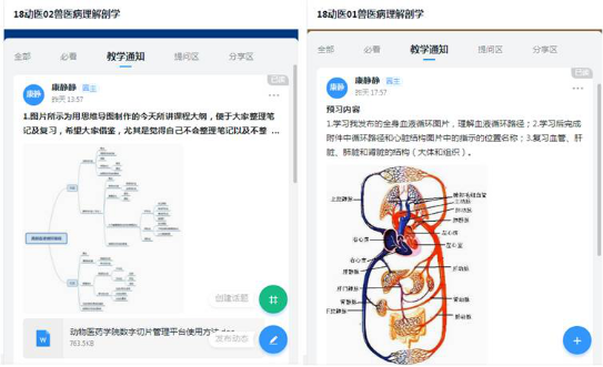 如兽医病理学课题组康静静老师通过“学习圈”提前发布各项学习资料,并指导预习;直播上课时,通过“标记书写”功能帮助员工更好的理解课程内容,并通过“互动面板”功能与员工进行提问互动。