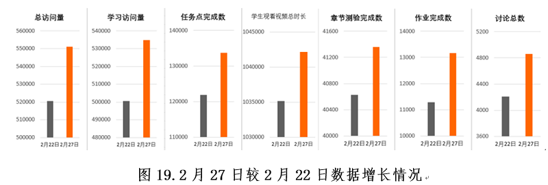 截止到2月27日,公司52教师在超星(学习通)网络教学平台建课上课,占承担理论课程教师的67.9%,总访问量达到551040人次,其中学习访问量534912人次,任务点完成数133746个,其中视频任务点完成数76380个,员工观看视频总时长1042112分钟,章节测验完成数41363个,作业完成数13171题,讨论总数4859人次等,以上数据说明教学运行状况良好。