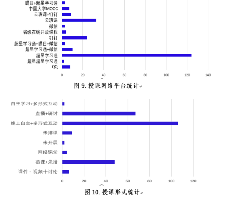 任课教师主要使用超星学习通、云班课、钉钉、微信、中国大学MOOC等以及多平台共用;授课形式以线上自主+多形式互动、直播+研讨、慕课+录播为主,个别课程使用自主学习+多形式互动、网络课堂等;90%课程按照课表执行;除个别课程进度比授课慢和个别讨论型实验课提前外,93%的课程进度与授课计划一致。任课教师所采用的授课平台、所使用的授课形式统计、授课时间、授课进度结果分别如图9、图10、图11、图12所示。