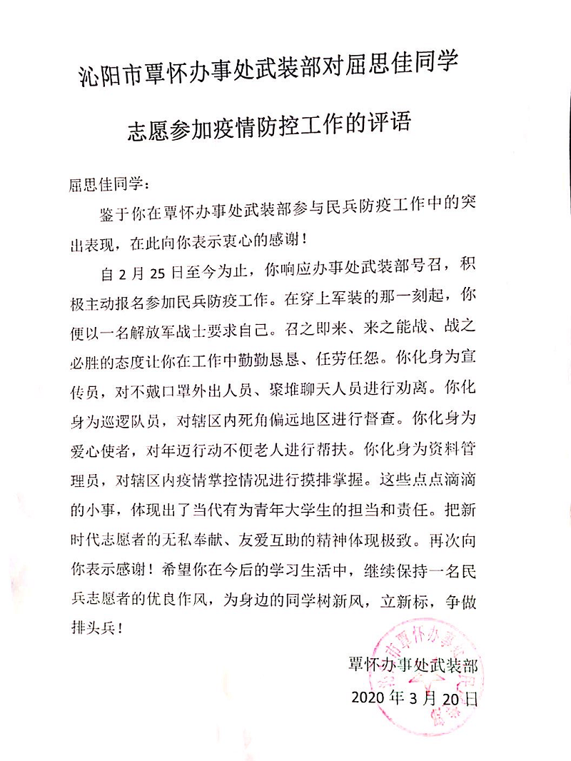 近日,沁阳市覃怀办事处武装部发来感谢信,对必赢242net2019级宠物医学01班员工屈思佳同学在家乡疫情防控工作中的突出表现予以表彰和感谢。