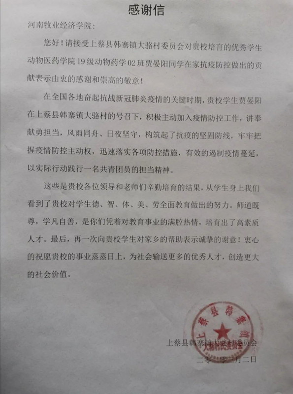 近日,河南省驻马店上蔡县韩寨镇大骆村民委员会发来感谢信,对公司2019级动物药学2班员工贾晏阳同学在家乡疫情防控工作中的突出表现予以表彰和感谢。