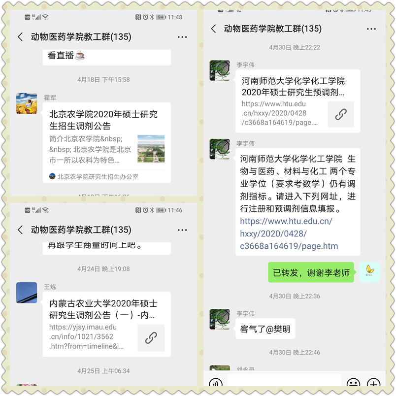 考研初试成绩出来后,为更好地对员工开展有针对性的指导,辅导员老师通过多种渠道统计员工的初试成绩,预估员工的达线情况,使员工们提前做好思想准备,同时这些信息的统计也使学院能够更好的整合资源,发动全院教师共同做好复试信息的收集、联系推荐院校、调剂政策解读等,其中公司霍军、李宇伟、王炼等多位老师搜集了吉林农业大学、沈阳农业大学、山西农业大学、北京农学院等20余所院校的考研调剂信息,为初试成绩不理想的同学们提供了二次选择的机会。学院利用微信公众号开辟了考研直通车专栏,持续为员工提供考研复试和调剂的信息推送服务,全员共筑学子“深造梦”。
