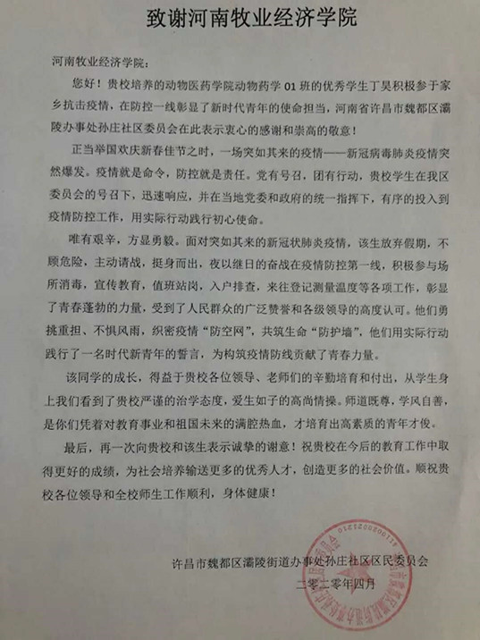 近日,许昌市魏都区灞陵街道办事处发来感谢信,对公司必赢242net2019级动药一班员工丁昊同学在社区疫情防控工作中的突出表现予以表彰和感谢。
