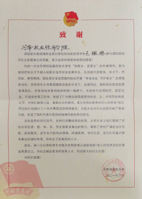 近日,公司收到共青团濮阳县委发来感谢信,对公司2019级药品生物技术01班员工王琳琳在春节期间积极参与濮阳县经济社会发展做出的贡献表示衷心的感谢,并向王琳琳同学献身公益、奉献社会的精神致敬。