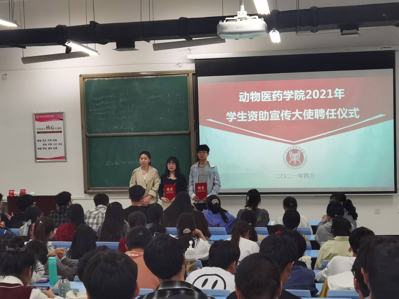 仪式上,资助专员谷老师宣读了聘任决定,并向获聘员工18动药(中兽药)01班马铭雪、19药品生物(专)01班贾心语颁发聘书。随后向大家介绍了两位同学的优秀事迹,号召同学们以他们为榜样,向他们学习。并告诫全体员工,加强员工资助宣传工作是全面落实党和国家员工资助政策、营造良好舆论氛围的迫切需要,成为员工资助宣传大使,既是荣誉也是责任。希望两位获聘员工敏于求知,做资助政策的学习者;砥砺前行,做资助政策的传播者;饮水思源,做感恩奉献的践行者。