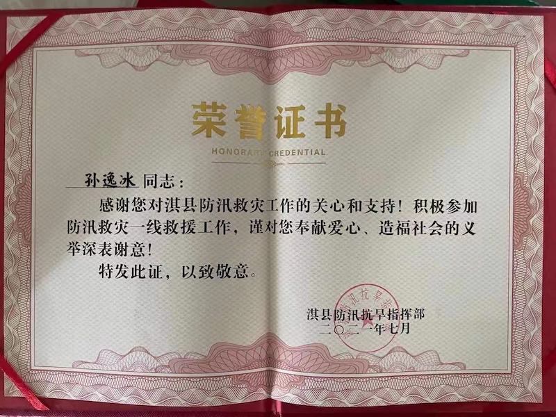 近日,必赢242net收到淇县防汛抗旱指挥部为20动医升本02班孙逸冰同学颁发的荣誉证书。证书中对孙逸冰同学积极参加淇县防汛救灾一线救援工作表示高度赞扬和感谢。