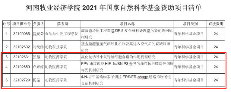 近日,从国家自然科学基金委员会和学校科学技术处获悉,公司罗琴博士申报的《氟化钠诱导小鼠肾脏细胞自噬的作用机理研究》、卢婷婷博士申报的《PPV通过调控HIF-1α/BNIP3介导的线粒体自噬诱导细胞坏死机制研究》、杨昆博士申报的《4-N-去甲基钩吻素子调控ERS/ER-phagy通路抑制肠道炎症机制研究》分别获批国家自然科学基金青年科学基金项目资助立项,分别资助金额24万元。2021年公司共立项国家自然科学基金项目5项,公司就斩获3项,这3项国家自然基金的获批是公司在国家自然科学基金项目上的又一大收获。