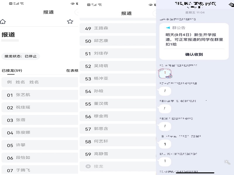 在21级新生线上报到工作会上,新生班辅导员对报到的同学们表示最热烈的欢迎,在会后对各班不能报到员工的具体原因进行排查了解,并做好登记备案工作。受今年疫情影响,各新生班辅导员在取得新生信息后,第一时间便建立了覆盖全体新生的微信群、QQ群,及时对2021级新生进行思想教育,引导新生密切关注疫情动态、积极接种疫苗、加强个人防护、关注自身健康等,并要求21级新生于8月31日起正式进行“钉钉”健康打卡,如实上报健康情况。