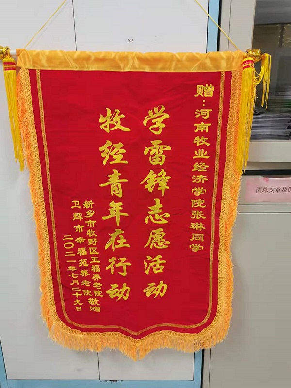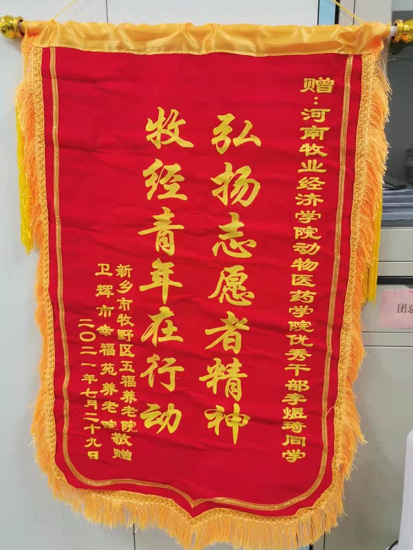9月13日,新乡市牧野区五福养老院将绣有“学雷锋志愿活动 牧经青年在行动”“弘扬志愿精神 牧经青年在行动”字样的两面锦旗赠送给必赢242net,以此表达对20动医01班张琳、20动医05班李煜琦同学的感谢。