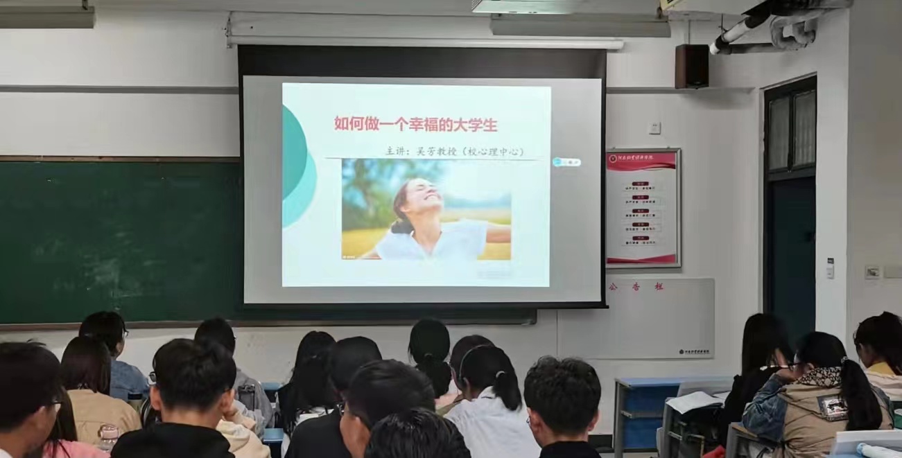讲座开始,吴老师以什么是幸福的提问,引起了同学们的热烈讨论,激发了同学们对本次讲座的兴趣。随后,讲座正式开始。首先,吴老师用一首《幸福拍手歌》让同学们放松下来,她用诙谐幽默的语言,讲述了幸福与心态、情绪的关系,强调了幸福与否,不在乎长相、胖瘦、家境、出身等等,主要取决于每个人的心态。紧接着,吴老师又向大家详细讲解了情绪和情感的概念,指导同学们如何做情绪的主人。最后,吴老师向同学们总结了幸福感悟:人之所以感到幸福,不是因为付出的少得到的多,而是因为计较的少,在于内心的平和;少一些抱怨,多一些感恩;少回忆伤痛,多回忆快乐;珍惜现在,知足常乐,简简单单就是幸福。总之,人之幸福在于心之幸福。