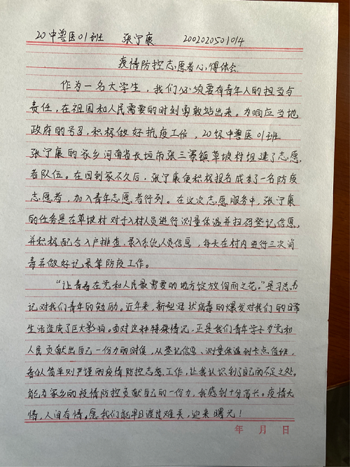 20中兽医01班的张宁康积极参加家乡长垣市张三寨草坡村志愿者队伍,在这次志愿者服务中,张宁康的任务是在草坡村对于入村人员进行测量体温并扫码登记信息,配合入户排查,录入人员信息,每日在村内进行三次消毒并做好记录。