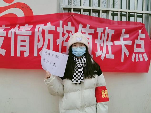 疫情再次来袭,各地病例纷纷出现,形式一度的严峻起来,各地做出对策来迎接这场“战役”,作为青年老员工19级制药01班范亭亭响应新乡市原阳县陡门乡周庄村号召,报名成为志愿者。“每次值班回家都会经过整个村庄,看到大家都安全的井然有序的生活便觉得这是莫大的幸福,我身虽小却可以为守卫家乡安全尽我所能。虽然早晨到达防疫点睫毛头发会挂满冰霜,虽然晚上归家时脸会冻得通红,但是我却感到满满的幸福与踏实感,也因此能共情到医务人员以及共同抗疫的工作人员的辛苦与付出。”范亭亭如是说。