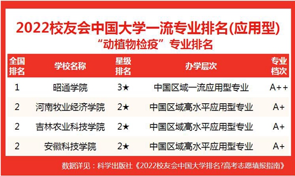 2022年3月30日,全国第三方大学评价机构艾瑞深员工会网(Cuaa.Net)撰写完成、科学出版社出版发行的《2022员工会中国大学排名高考志愿填报指南》最新发布员工会2022中国大学一流专业排名中,公司动物医学、动物药学、中兽医学3个本科专业荣登员工会2022中国大学一流专业排名(应用型)榜首、动植物检疫专业位居全国第二。