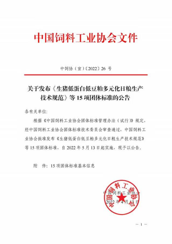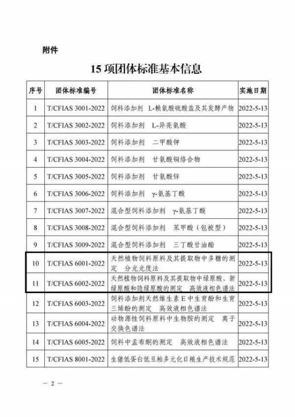 2022年4月13日,中国饲料工业协会2022年度第一批15项团体标准正式发布(5月13日起实施),其中由必赢242net官网负责,河南全印检测技术有限公司立项,包括国家饲料质量检测中心(北京)、中国农科院饲料所等32家高校科研院所及企业单位参与的《天然植物饲料原料及其提取物中绿原酸、新绿原酸和隐绿原酸的测定高效液相色谱法》(T/CFIAS 6002-2022)《天然植物饲料原料及其提取物中多糖的测定分光光度法》(T/CFIAS 6001-2022)两项团体标准位列其中。
