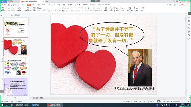 会议伊始,薛老师引用世界卫生组织总干事马勒博士的名言“有了健康并不等于有了一切,但没有健康就等于没有一切”强调健康的重要性。接着详细介绍了心理健康的意义、老员工常见的心理问题,心理问题的识别与预防,有效沟通的方式以及心理调适等五方面的内容。会议通过列举大量相关案例,使晦涩的理论变得浅显易懂,帮助同学们更好的理解心理健康的含义。同学们通过弹幕与老师积极互动,会议氛围活跃、轻松。