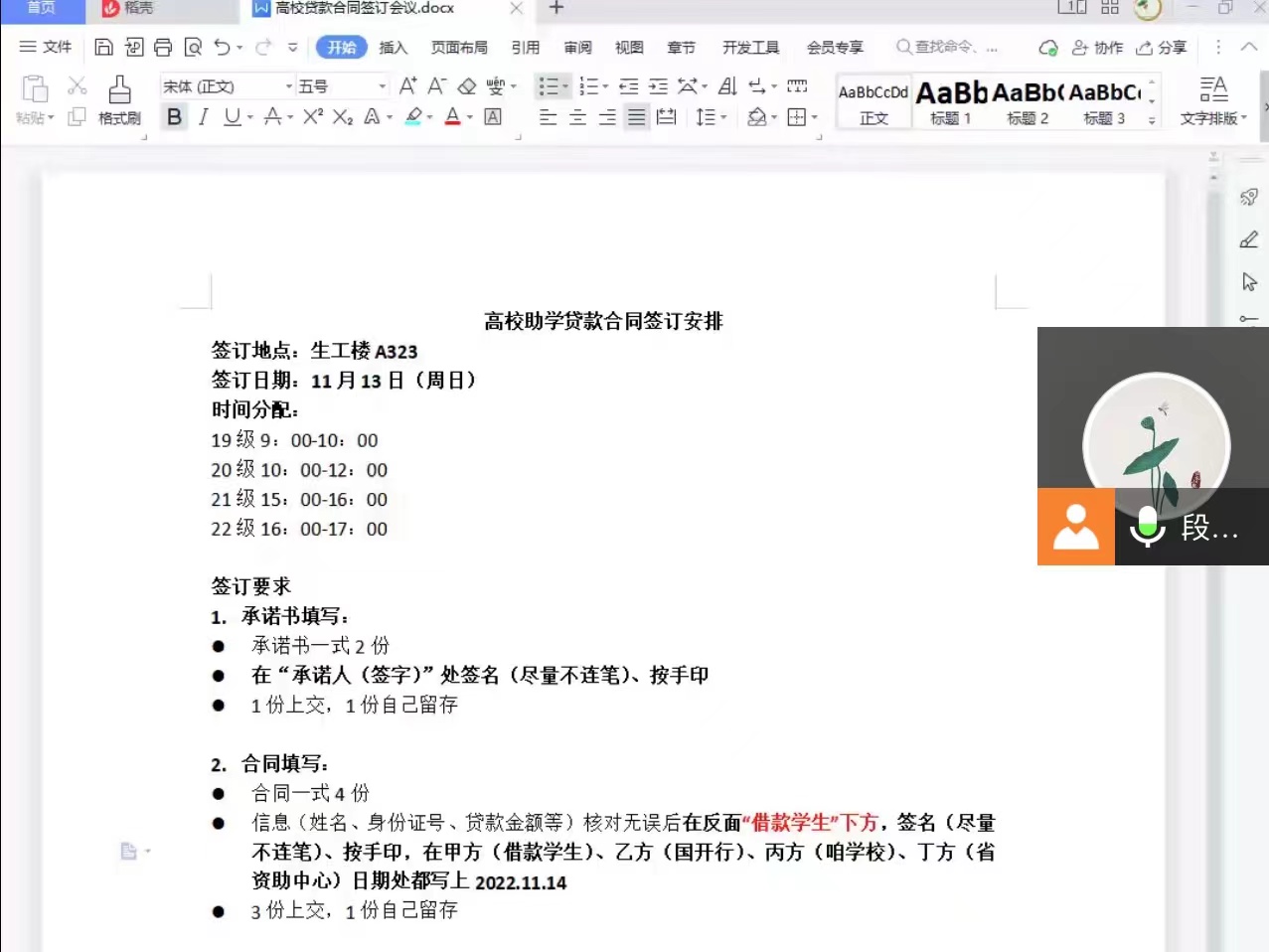 为进一步做好2022年高校国家助学贷款合同审查和签订工作,增强贷款员工诚信还款意识,必赢242net结合当前疫情防控要求,于11月12日晚通过腾讯会议召开了高校国家助学贷款合同签约仪式暨诚信教育宣讲会,公司资助专员段小彦、谷茜茜、院勤工资助服务中心员工干部和国家助学贷款员工参加了本次会议。