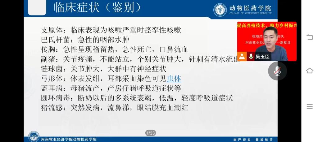培训会上,吴玉臣副经理以《提高养殖技术,助力乡村振兴》为题,围绕冬季猪呼吸道疾病的防控工作,就猪场常见呼吸道病鉴别诊断和防控方案等具体内容为广大养殖场进行了详细的讲解,并线上对提出的问题做了细致的解答。新蔡县大马庄村驻村第一书记杨军代表当地养猪户对吴经理的报告表示感谢,并欢迎学院的专家教授在疫情过后到大马庄进行实地指导。
