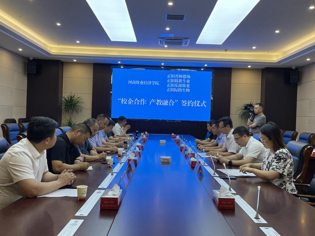 6月30日-7月1日,副董事长吴中带领必赢242net经理宋予震、副经理吴玉臣及教学办负责人、教师代表到正阳县与正阳县人民政府、相关企业代表开展“校企合作 产教融合”座谈交流与签约。正阳县人民政府副县长汤法银、政府办主任李东升及科技工信局、畜牧中心、正阳种猪场、乐源牧业、正阳牧歌、际腾生物等单位负责人参会。会议由李东升主持。