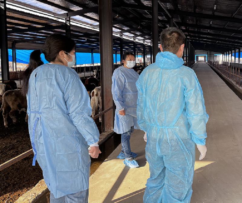 在奥天牧业有限公司负责人颜雪的带领下,科技特派员一行查看了牛舍各阶段奶牛的饲养管理现状,了解近期奶牛场总体的疫病防控、奶品产量及销售情况。服务团成员根据临床经验就近期来临的气温骤降对奶牛的影响提出一系列的防范措施,同时进行了针对性的技术指导。最后刘玲玲博士又前往牛场牧草及饲料储备厅采样带回检测,持续关注饲草及饲料原料质量控制,确保奶牛日粮安全。